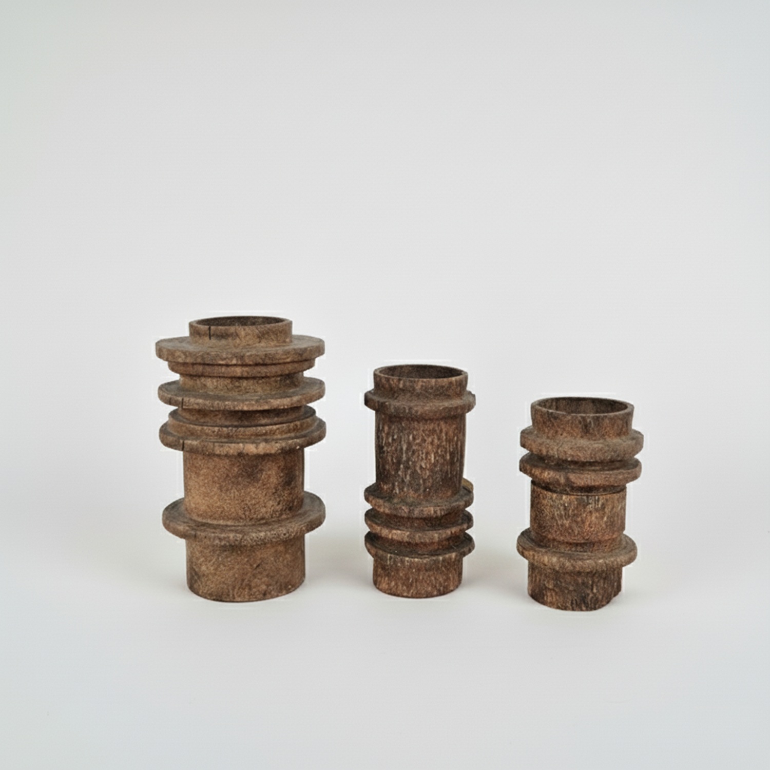 The Aurelius Column Trio is a distinguished collection crafted to bring soulful warmth and architectural grandeur into your space. Each of the three candle stands rises with stately presence, their pillar-like silhouettes carved from richly textured natural wood that speaks of timeless craftsmanship.
