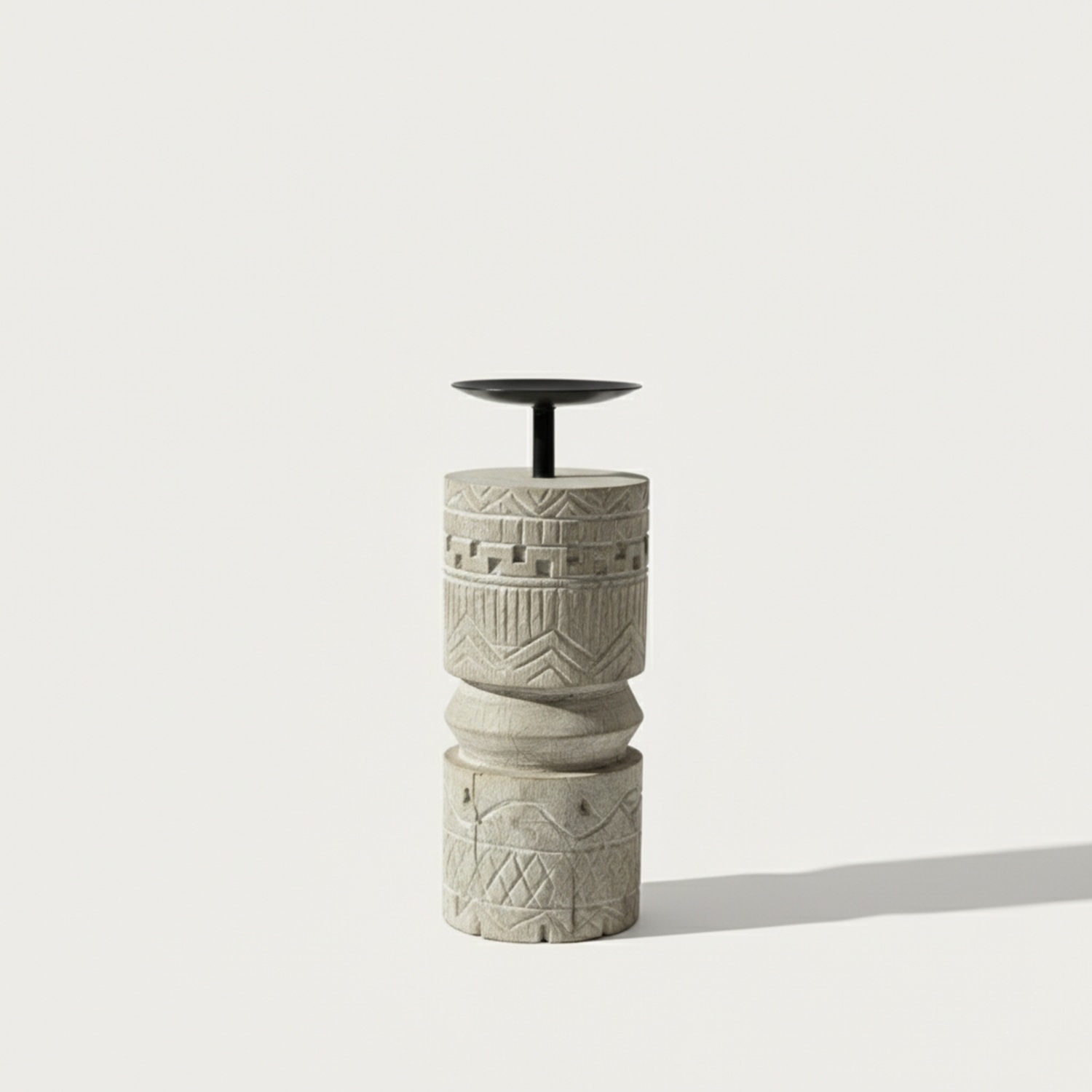 The Eryndel exudes quiet power and artisanal sophistication, merging ancient motifs with contemporary elegance. Its geometric, rune-inspired carvings and sand-blasted grey finish create a tactile, stone-like texture that transforms candlelight into a mesmerizing play of shadow and depth.