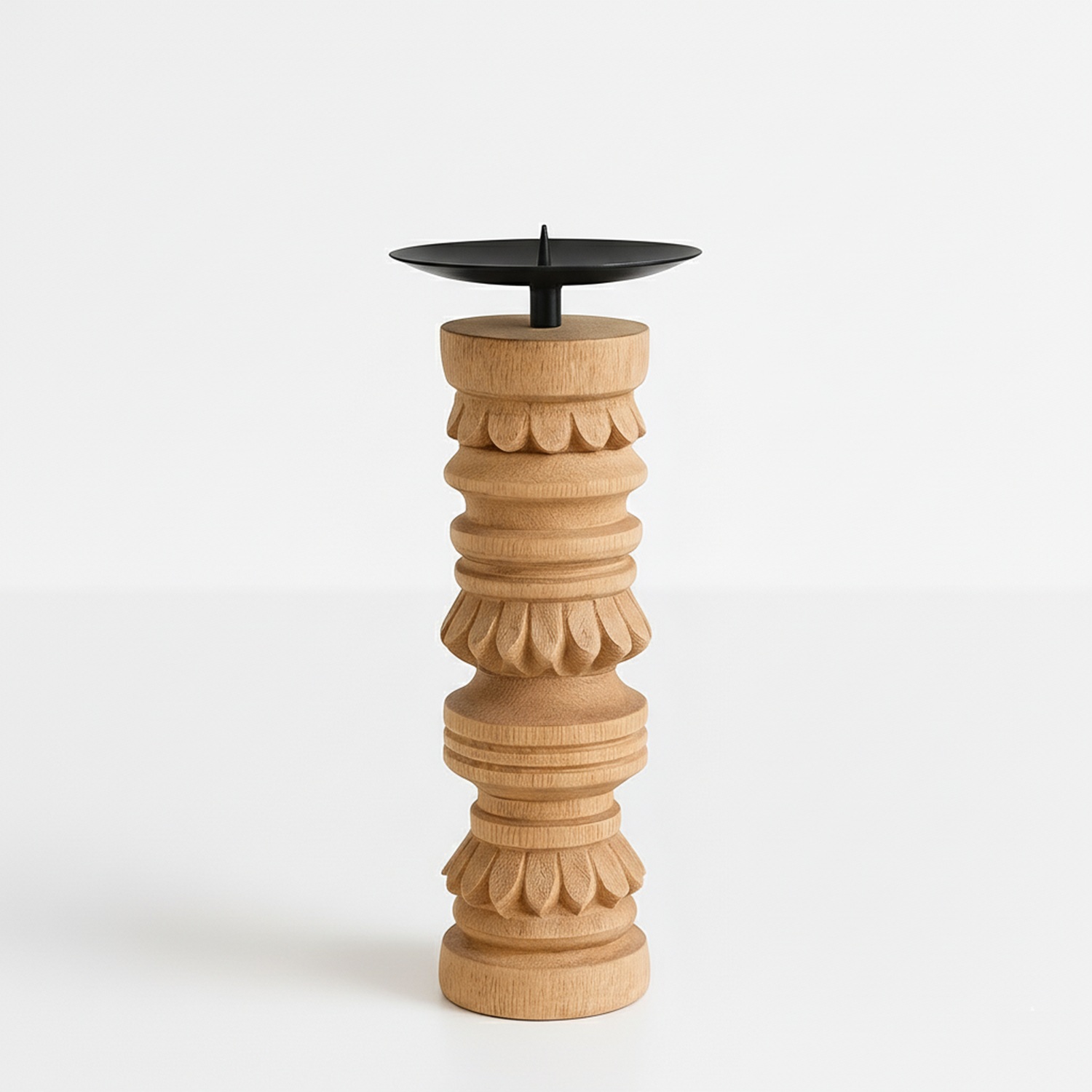 The Liora Candle Stand celebrates the beauty of natural wood and timeless craftsmanship. With its layered carvings and graceful form, it evokes the elegance of European decorative traditions while embracing a warm, modern simplicity.